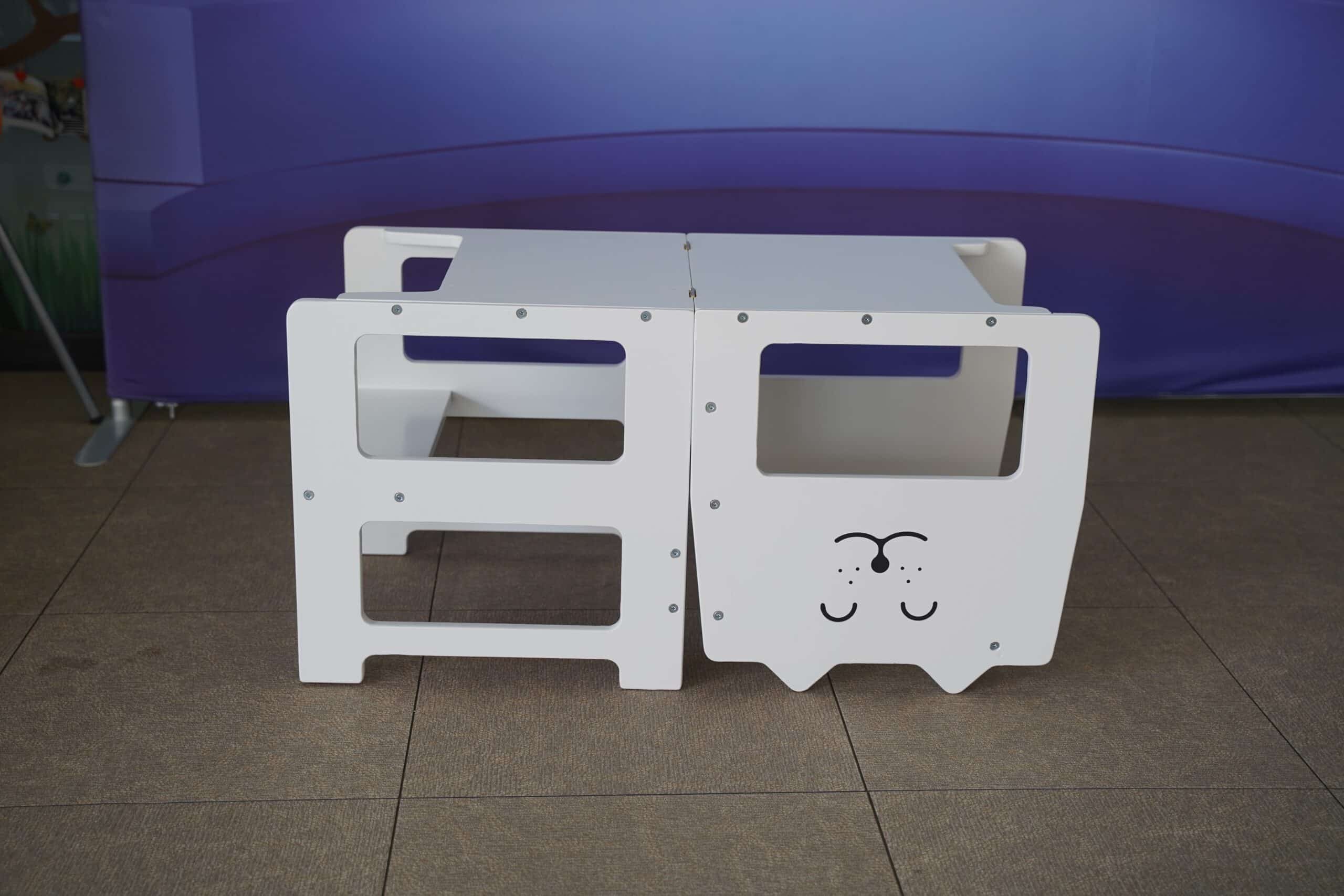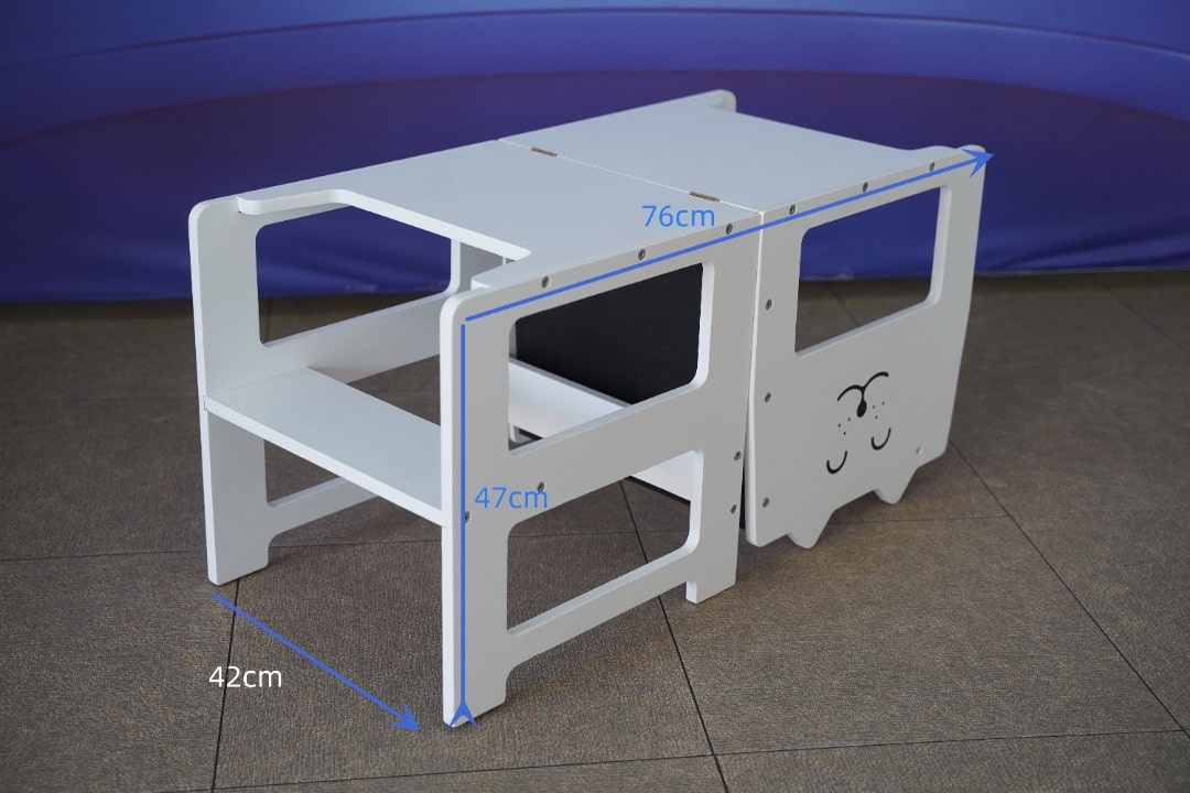 Fabricada en madera sostenible, esta estructura robusta y segura permite que los niños participen activamente en las tareas diarias. Ya sea para lavarse las manos, cepillarse los dientes o ayudarte a preparar la comida, esta torre les brinda independencia y confianza en sí mismos. Además, con un simple ajuste, se convierte en una mesa y silla ideal para pintar, jugar o merendar.